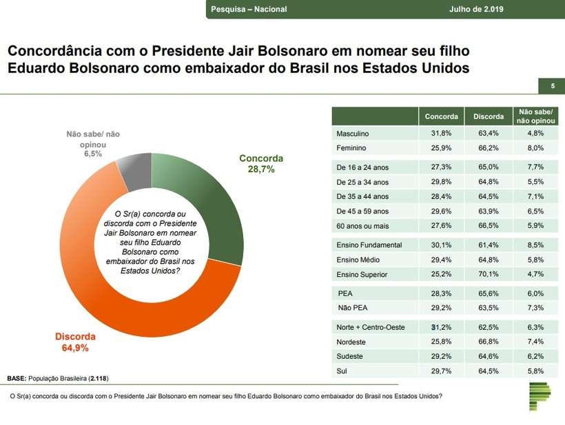 Segundo o levantamento, 64,9% da população discorda da nomeação. Apenas 28,7% concordam que o deputado federal ocupe o posto diplomático mais importante fora do país. O percentual dos que não sabem ou não quiseram opinar sobre a questão é de 4,8%.