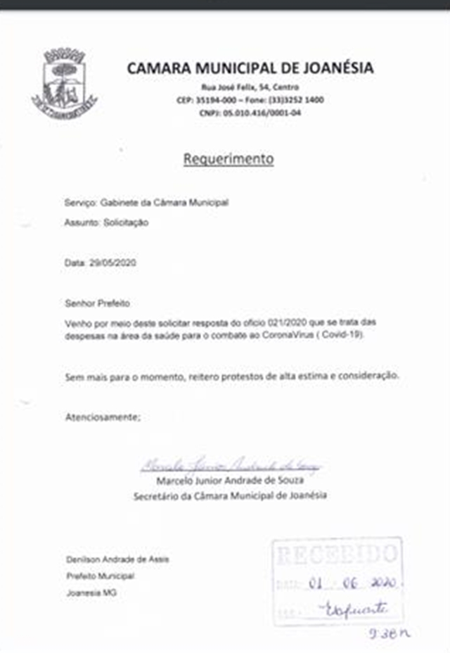 No dia 29 de Maio de 2020 encaminhamos novamente um requerimento ao prefeito Denilson Andrade de Assis reiterando o ofício encaminhado no dia 14 de Abril de 2020. Nos estamos fazendo o nosso papel de fiscal do Povo . somos os olhos e a boca da população exigimos respeito e transparência com dinheiro publico.Afirma o vereador.