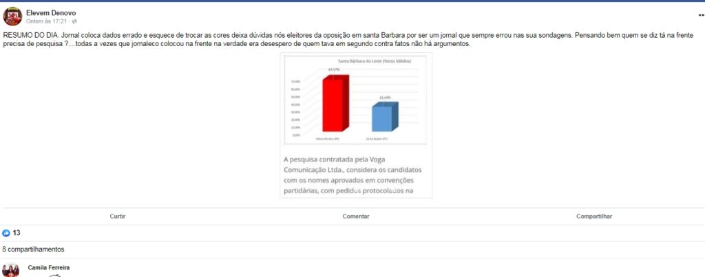 Um jornal de circulação do município de Caratinga- MG, publicou uma pesquisa de intenção de votos no município de Santa Barbara do Leste , e deu o que falar nas redes sociais , foi assunto mais comentado na cidade chegando viralizar na rede social. Para os internautas a pesquisa é falsa.