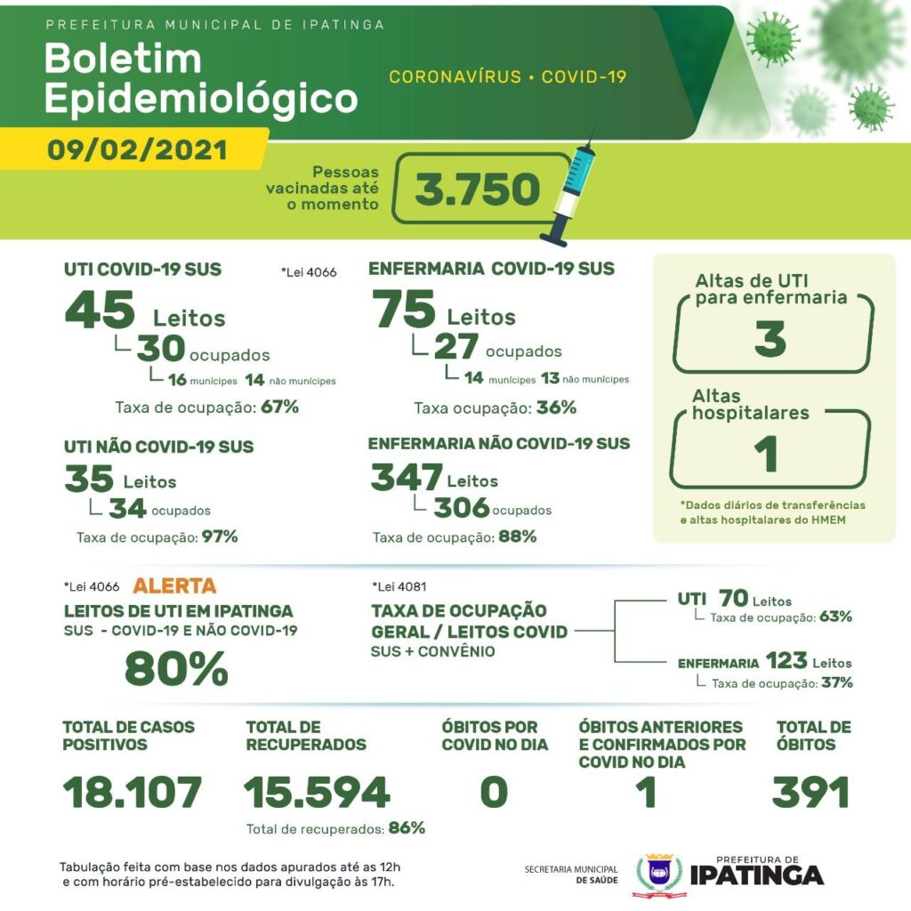 A PMI divulgou na tarde de hoje o boletim epidemiológico da cidade, de acordo com o informativo, Ipatinga-MG chegou a marca de 18.107 casos positivos de Covid-19. O número de recuperados é de 15.594, o que equivale a 86%. O número de pessoas vacinadas na cidade chegou a 3.750.
