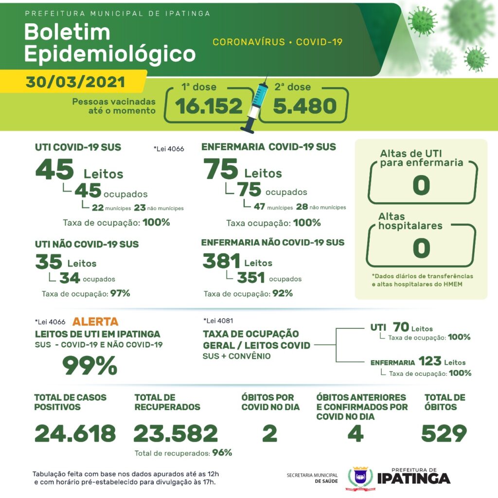 IPATINGA – A Prefeitura de Ipatinga registrou nesta terça-feira (30) mais 6 óbitos por covid-19. O total de mortes em decorrência da pandemia subiu para 529. O município registrou ainda um total de 24.618 casos positivos, 293 casos a mais do quem ontem (29) quando foram registrados 24.325. As taxas de ocupação nas UTIs continuam elevadas e em vias de saturação, assim como das enfermarias.