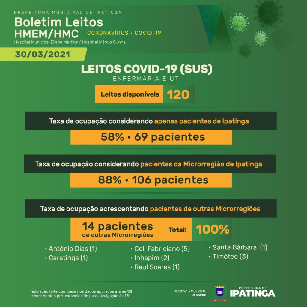 A Enfermaria covid-19 SUS está com 100% dos 75 leitos ocupados e a Enfermaria não covid-19 SUS tem 351 dos 381 leitos ocupados (92%). Não foi registrada nenhuma alta hospitalar.