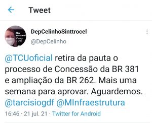 Informativo Publico:TCU retira o edital de concessão da BR-381 de pauta e adia votação em uma semana