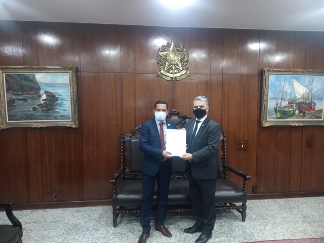 Vereador Ronaldinho entregando ao assessor especial Denílson  Teixeira , oficio ao senador Rodrigo Pacheco..