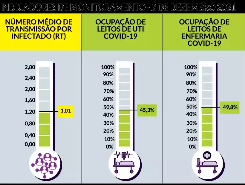 Já as ocupações dos leitos de UTI e de enfermaria continuam no panorama de controle, abaixo dos 50%. Na terapia intensiva, houve alta: de 38% para 45,3%, conforme o boletim epidemiológico e assistencial da prefeitura.