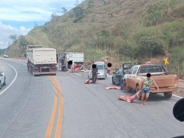 No entanto, pouco tempo após o ocorrido, dezenas de pessoas se dirigiram ao local do tombamento e começaram a saquear a carga. As imagens gravadas por motoristas que passavam pela rodovia mostram a intensa movimentação de populares retirando peças de carne do caminhão acidentado.